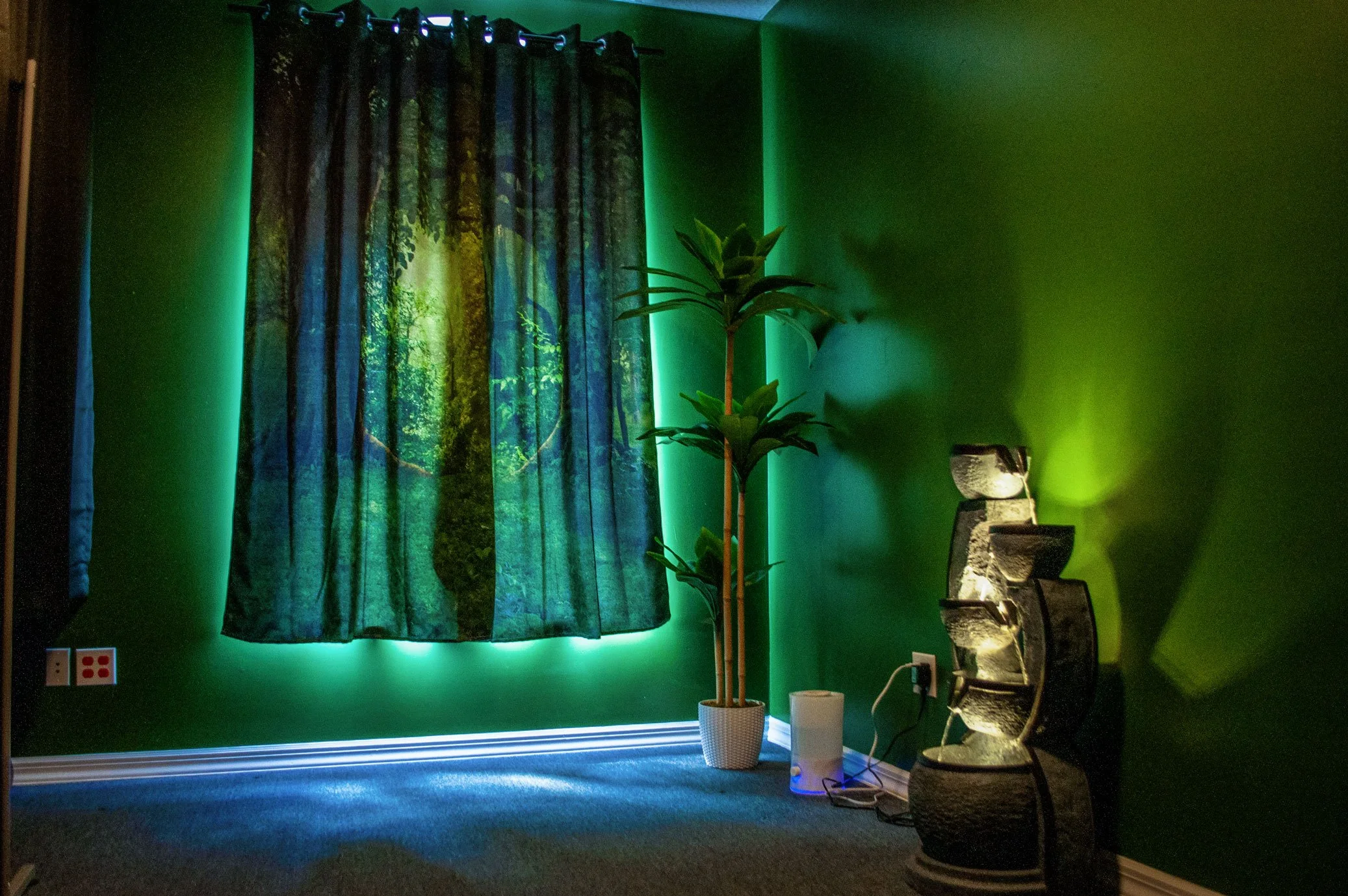 Step into the calming embrace of the Green Room, where deep green hues and natural elements create a tranquil escape. The soft glow of ambient lighting and the sound of flowing water invite you to let go of stress and restore your inner balance. With its grounding, earthy tones, and refreshing aromatherapy, the Green Room is perfect for those looking to rejuvenate both mind and body in a peaceful environment. Come to fully recharge in this beautiful space.